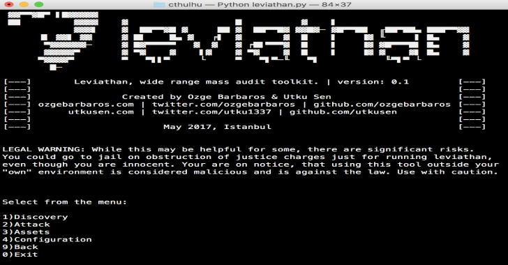 Leviathan은 취약점 탐지용 툴 패키지다. 오픈 된 서비스 확인, Brute Force, SQL 인젝션 탐지 등 기능을 실행할 수 있다. 해당 패키지에는 masscan, ncrack, dsss 등 오픈소스 프로글매이 포함돼 있어. 각 프로그램을 연동으로 사용하기 쉽게 만들었다. Leviathan은 광범한 IP대역에 대한 취약점 스캔을 위해 만들어 진 프로그램이다.