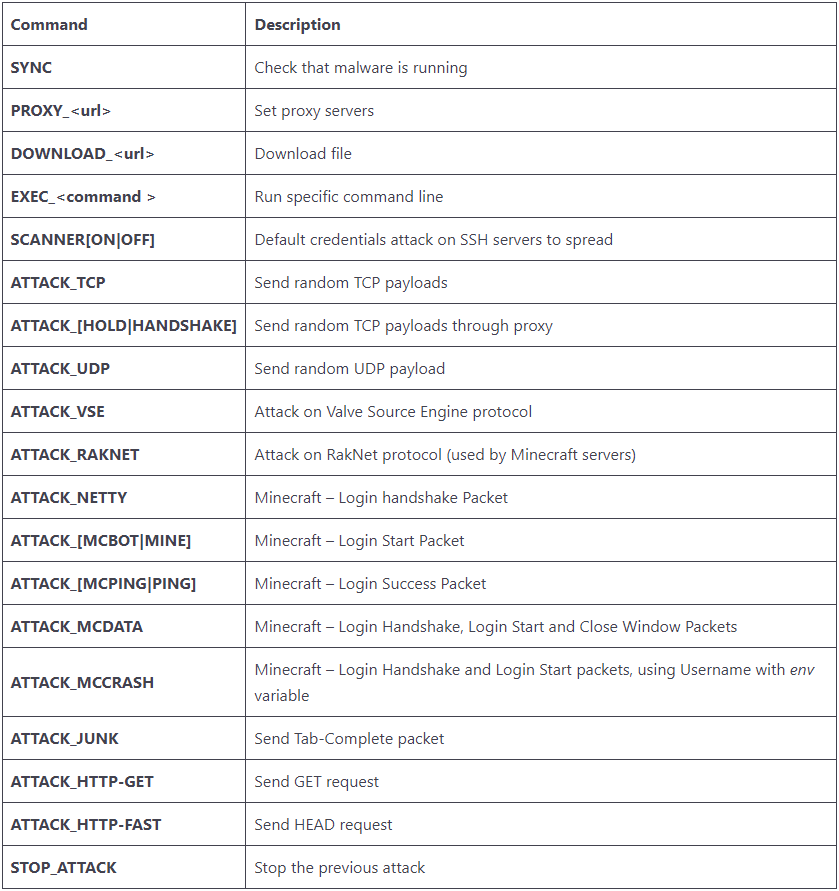 MCCrash는 초기 통신에서 식별된 운영 체제 유형에 따라 C2 서버에서 암호화 명령을 수신한다. 그리고 C2는 다음 명령 중 하나를 감염된 MCCrash 장치로 전송하여 실행한다.