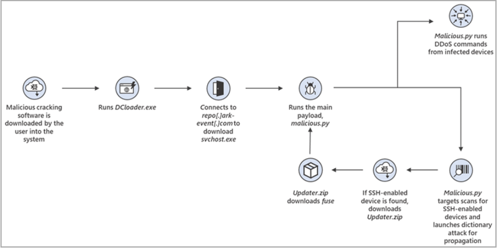 MS는 MCCrash가 윈도 활성화 도구와 마이크로소프트 오피스 라이선스 활성화 프로그램(KMS 툴)에 숨겨져 있으며 이를 이용해 불법 복제를 시도할 경우 사용자 시스템을 감염시킬 수 있다고 밝혔다. 이 도구에는 악성 PowerShell 코드가 포함되어 있고 해당 코드는 "svchosts.exe"라는 파일을 다운로드하여 "malicious.py"을 실행한다. 이 파일은 MCCrash의 주요 Payload다. 그 다음 MCCrash는 IoT 및 리눅스 기기에 대한 SSH 비밀번호 크랙 공격을 수행하여 네트워크의 다른 장치로 전파하려고 시도한다.