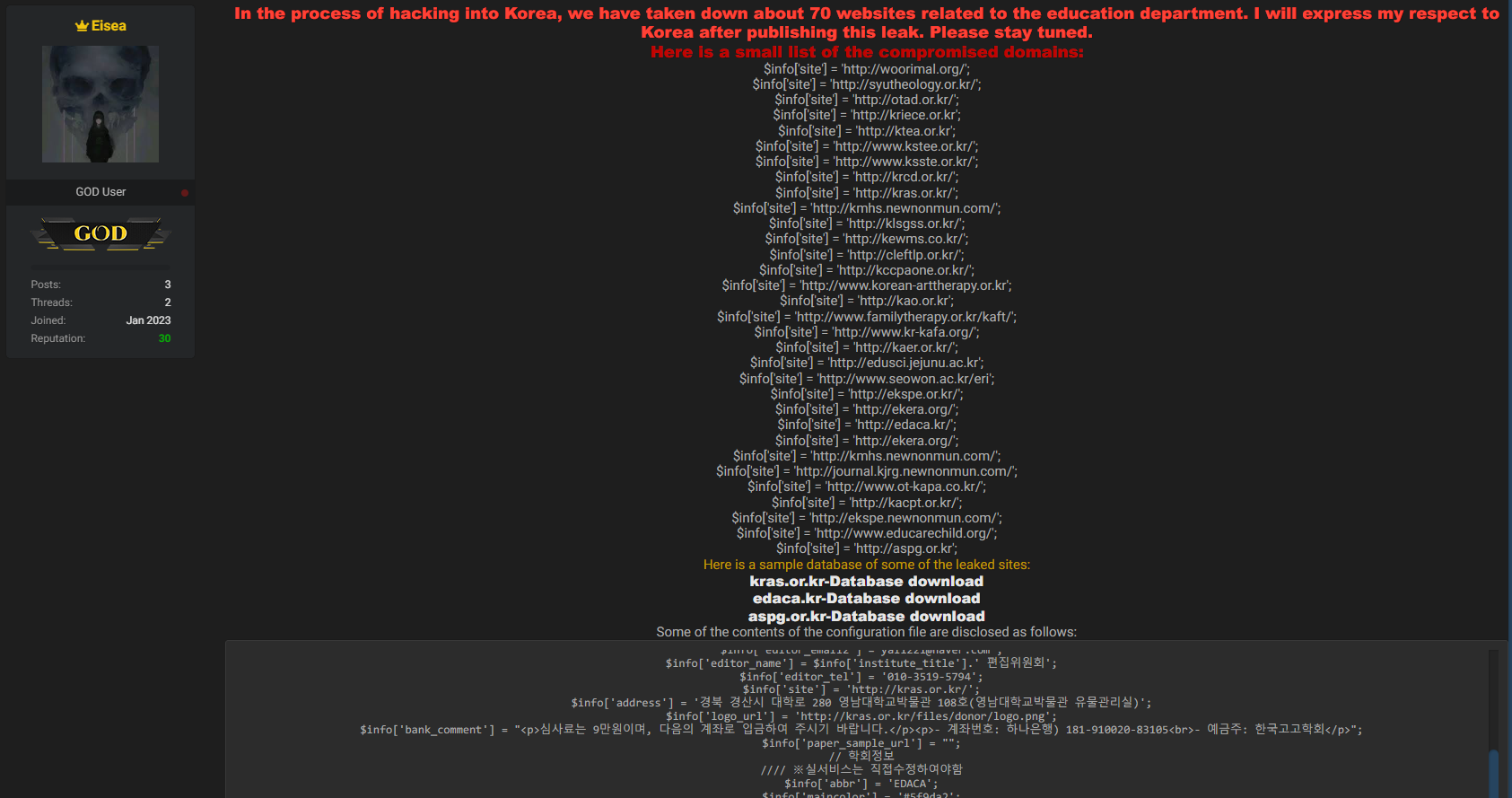 해킹 된 한국국내 웹 사이트들이 해외 해커 포럼장에서 판매되고 있습니다.