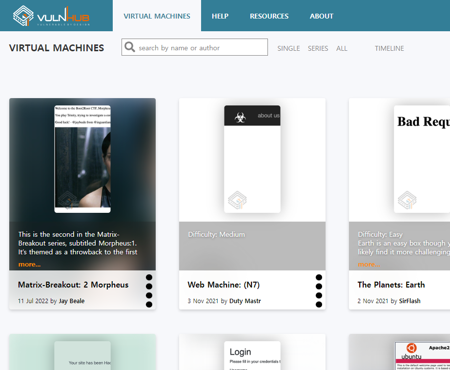 https://vulnhub.com/ 사이트는 해커들이 자신들이 세팅한 시나리오 환경을 가상머신을 이미지 파일로 만들어 서로 공유하는 플랫폼 입니다.